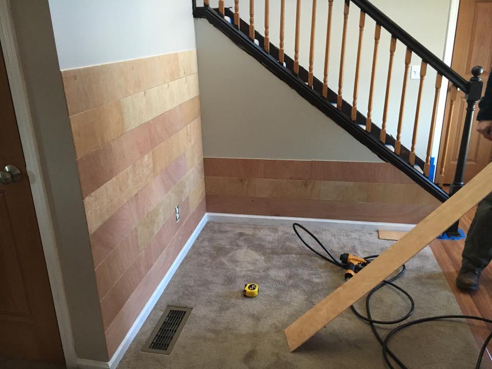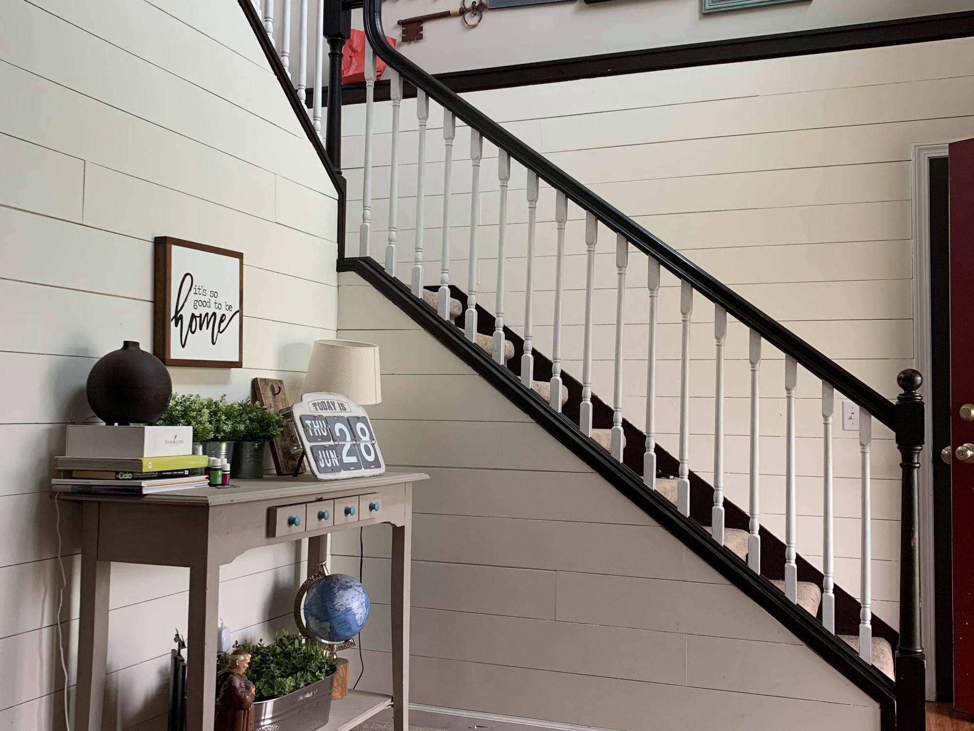 So, I bet you can imagine my husband’s surprise when I told him that I wanted to shiplap the stairway as our fun “New Years Eve” project! Ha! He’s such a good sport.